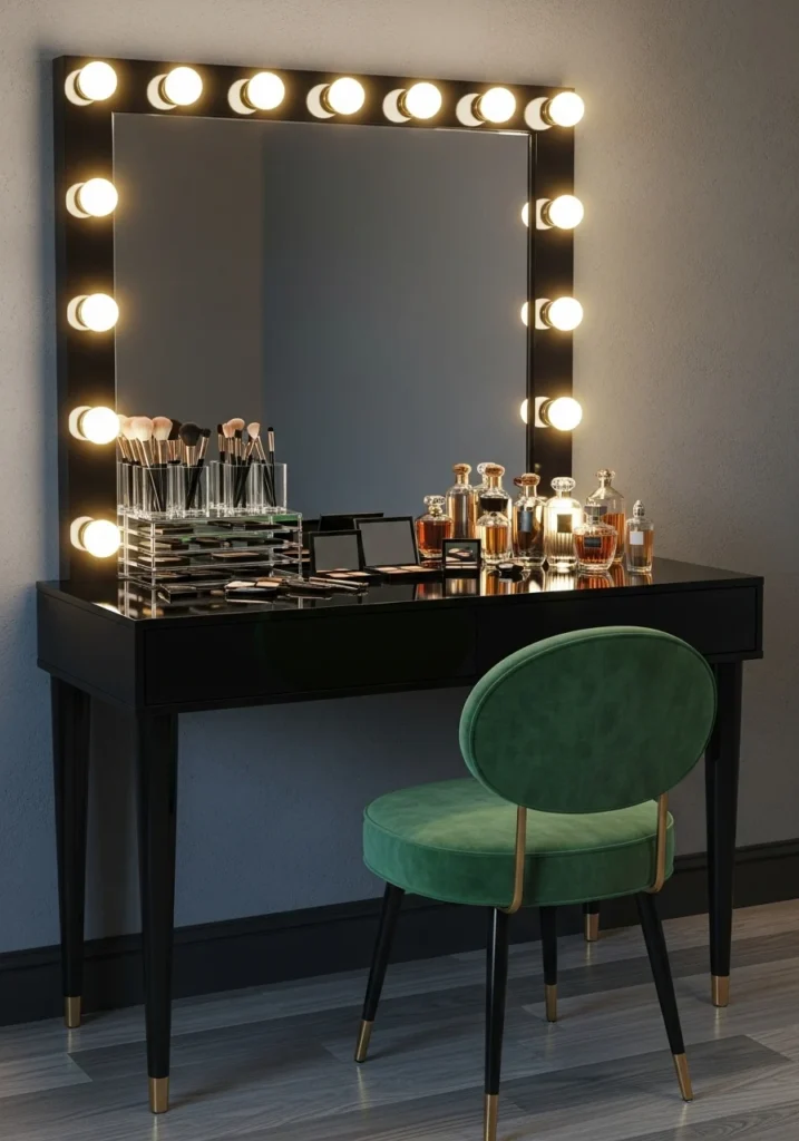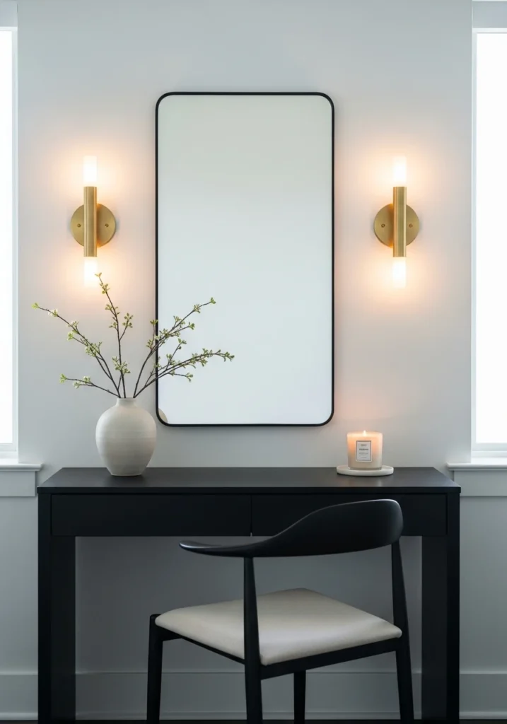Use matte black vanity table with slim black-framed mirror for elegant restraint. Add brass sconces on either side for warm metallic contrast.