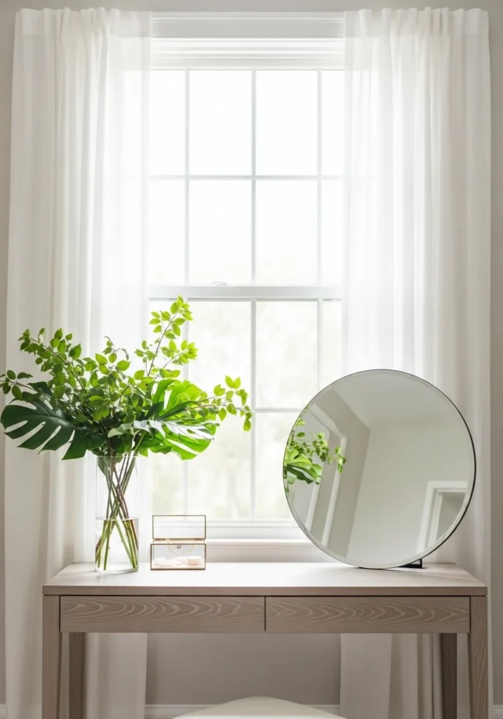Position vanity under tall window with sheer curtains to maximize natural light for most accurate color rendering during makeup application.