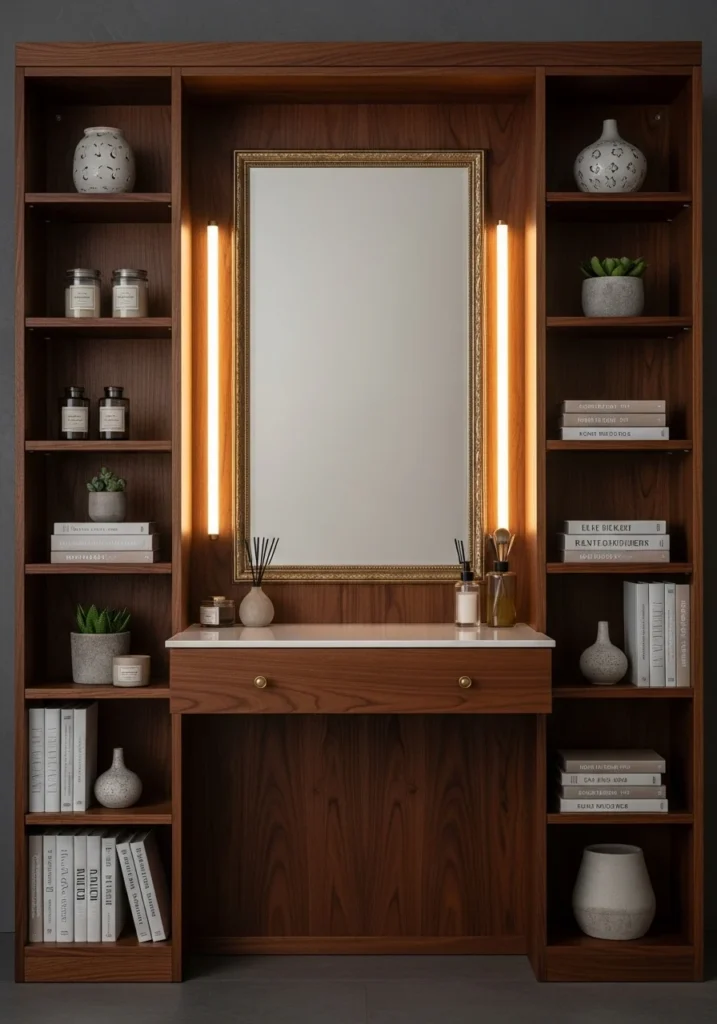 Integrate vanity into bookshelf unit with central mirror section and side shelving for books, decor, and beauty storage.