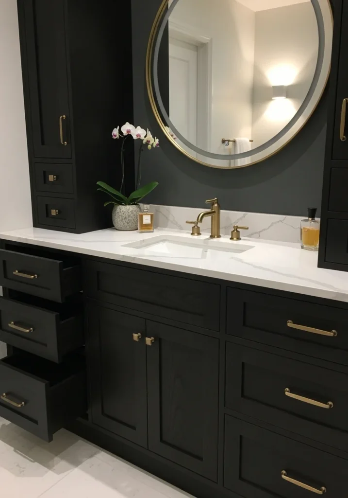 Top with quartz or marble surface for durability and luxury feel. Hidden storage keeps daily essentials organized but easily accessible.