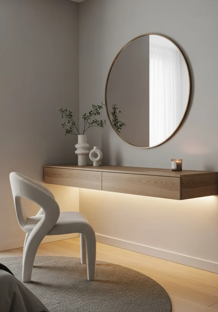 This approach works well for people who prefer clean, uncluttered spaces and want their vanity to blend seamlessly with modern bedroom design.