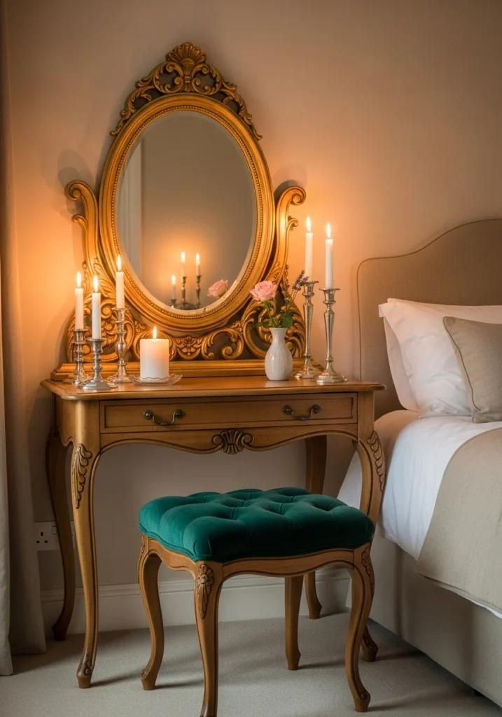 Create old-world luxury with gilded vintage-style mirror and ornate wooden vanity table paired with tufted velvet stool.