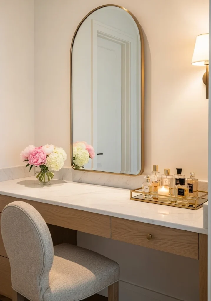 This approach works best for people who enjoy the ritual of getting ready and want their vanity to feel like a luxury dressing room.