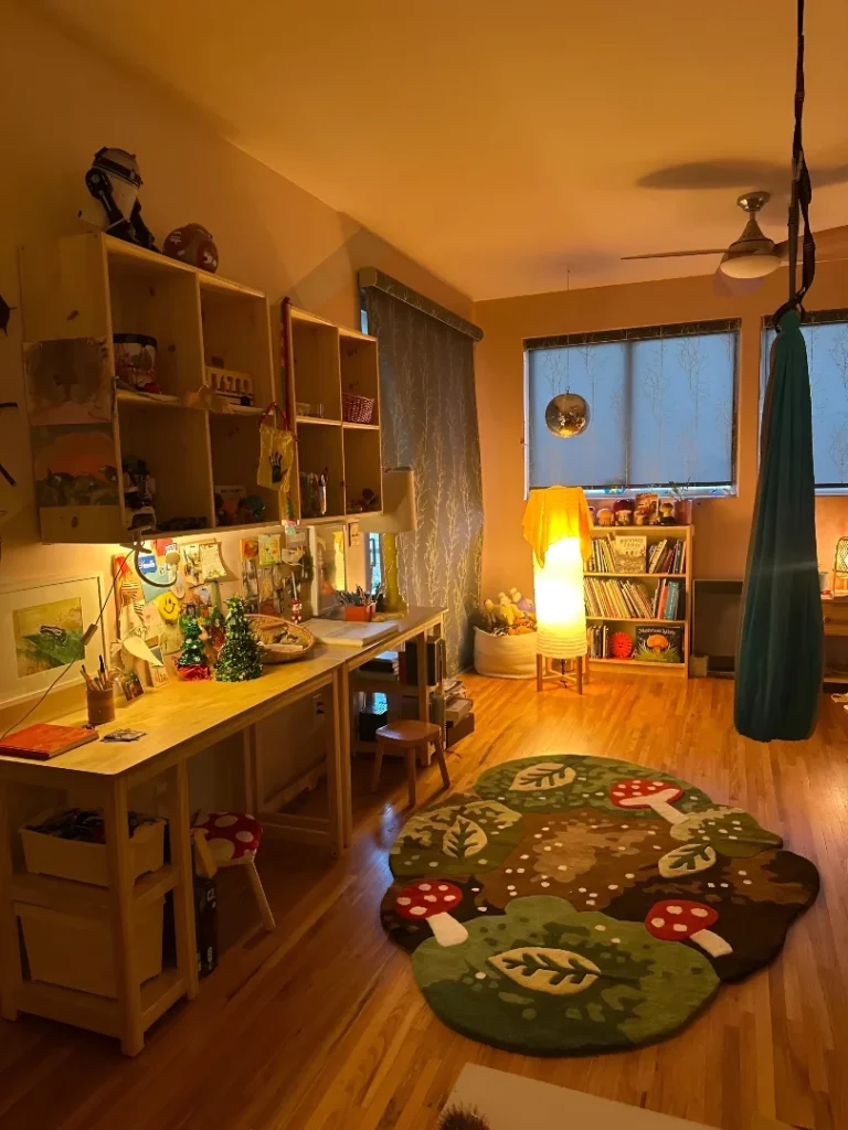 This is what happens when someone finally understands that kids’ rooms don’t have to be primary-colored nightmares. It’s giving ‘Montessori parent with taste and a budget.’ The entire room is bathed in warm, golden lighting—forget harsh overhead LEDs. Use warm-toned bulbs and layered lighting: a sculptural pendant, task lighting under shelves, and ambient lamps. Paint walls and ceiling a warm honey or soft amber tone to create an enveloping cocoon effect. The genius move? Modular cube storage in natural wood keeps chaos contained while looking intentionally Scandinavian. Load shelves with curated toys and books—yes, curated, because your kid doesn’t need forty plastic dinosaurs visible at once. Add a simple work table in natural wood with small chairs for creative activities. The floor is crucial: warm wood in a herringbone or plank pattern grounds the space. Hang sheer, nature-inspired curtains and add a whimsical area rug with organic motifs—mushrooms, leaves, forest creatures. The styling takeaway? Functional doesn’t mean ugly. Woven baskets, wooden toys, and earth-toned textiles create a space that’s playful without visual assault. This room whispers “we nurture creativity” not “we shop at big-box stores.”
