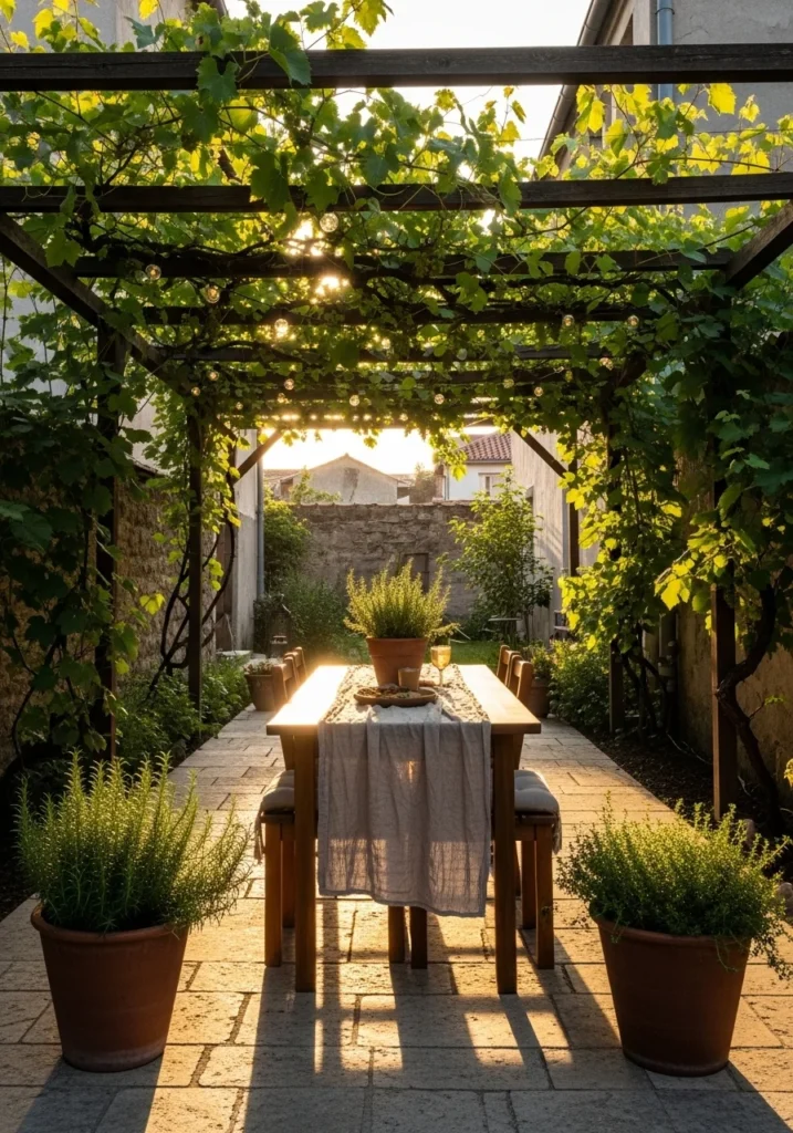 Add narrow dining table with linen runner and terracotta herb pots. String lights woven through vines provide evening illumination.