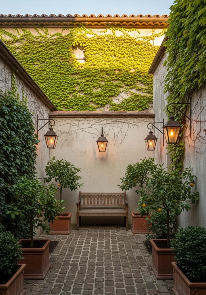 Create intimate courtyard enclosed by tall stucco walls covered with climbing ivy, cobblestone flooring, and rustic bench with wall-mounted lanterns.