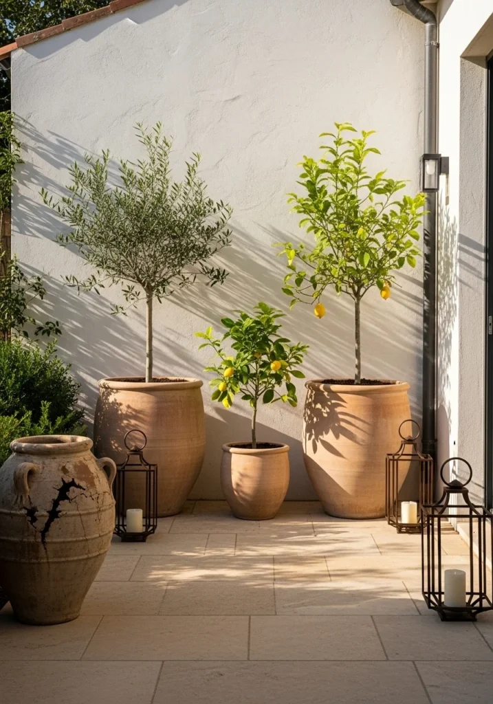 Group oversized terracotta planters with dwarf olive trees and lemon saplings against whitewashed walls for instant Mediterranean atmosphere.