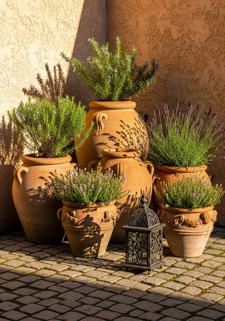 Group various-sized terracotta urns and planters filled with Mediterranean herbs against stucco walls for authentic courtyard atmosphere.