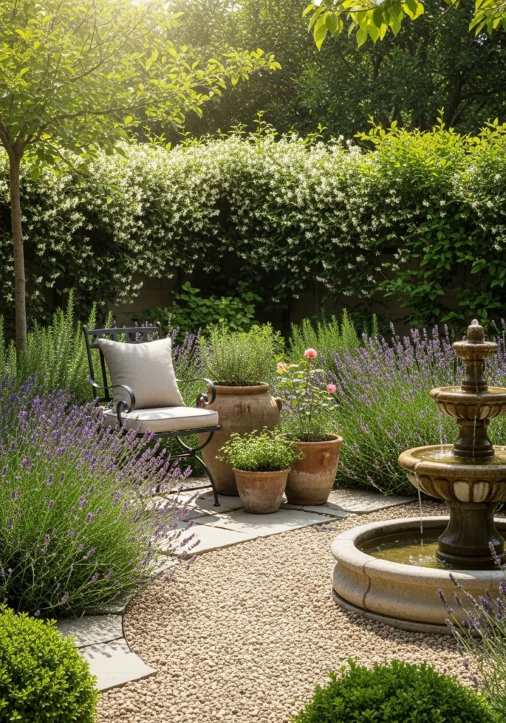 Plant lush lavender, rosemary, and jasmine near seating areas in terracotta pots with gravel pathways leading to compact fountains.