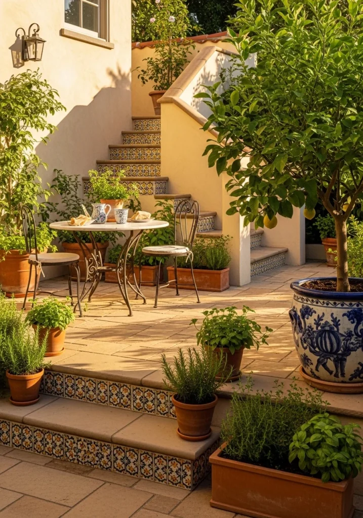 Incorporate Spanish ceramic patterned tiles on steps, walls, and pathways paired with limestone flooring and terracotta herb planters.
