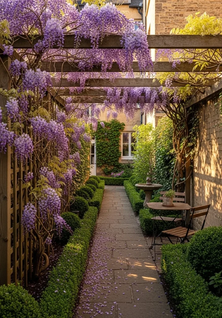 Install wooden trellis covered in wisteria or climbing roses for vertical drama and natural shade. Add narrow stone pathway with boxwood borders.