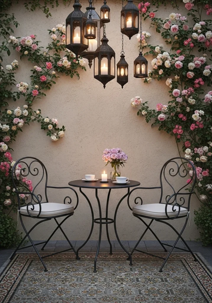Create intimate bistro corner with round wrought-iron table and scrolling chairs in matte black with cushions. Add mosaic tile underfoot and climbing roses on walls.