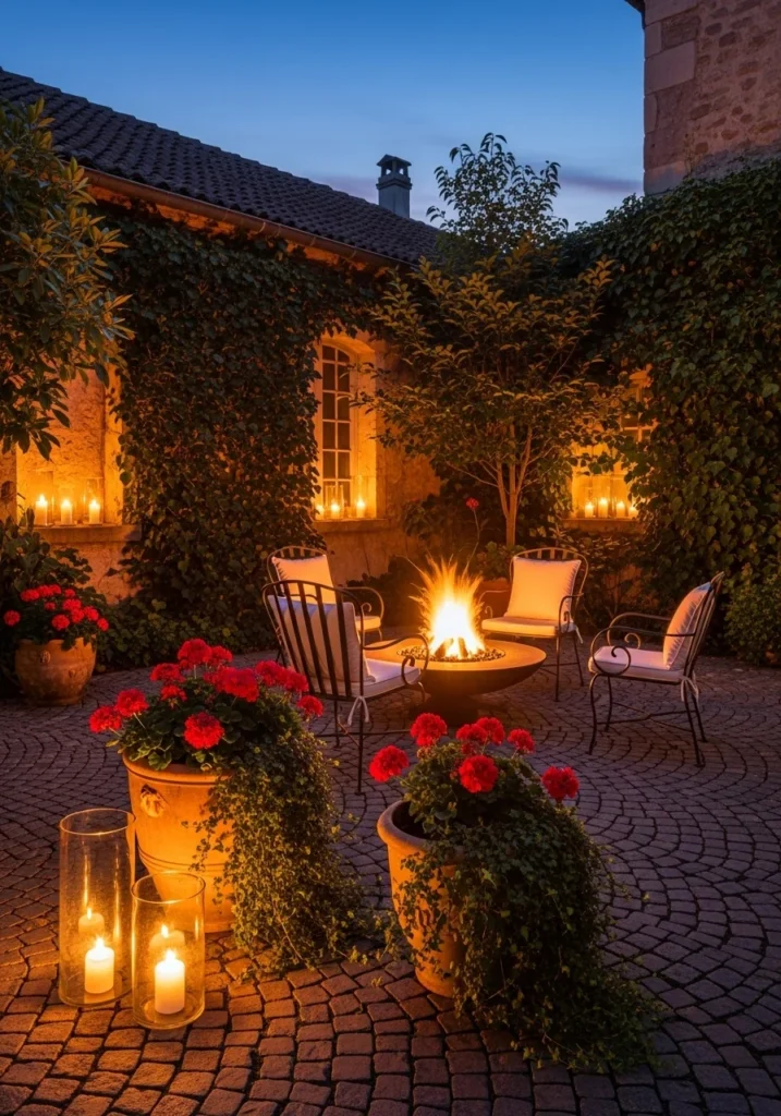 Add ivy-covered backdrop and terracotta planters. The flickering firelight creates cozy gathering space for cool evenings.