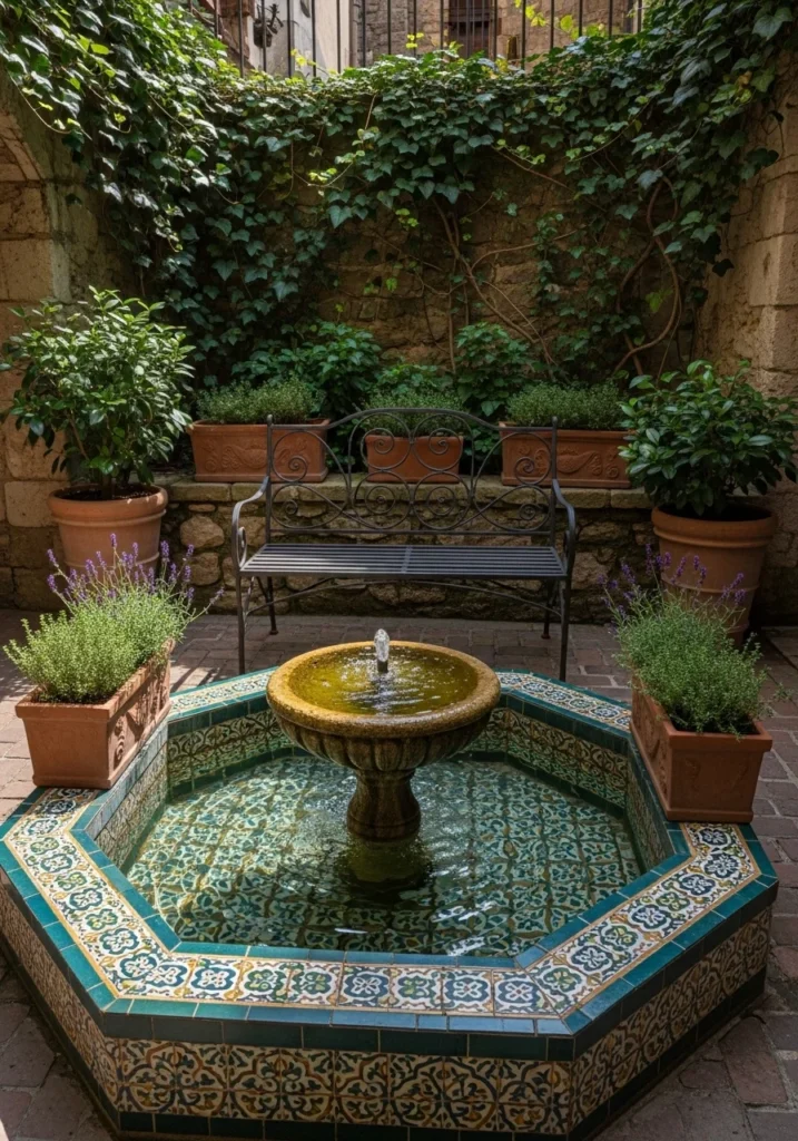 Install small stone basin fountain with gentle water trickling as the courtyard focal point. Surround with patterned ceramic tiles and climbing ivy.