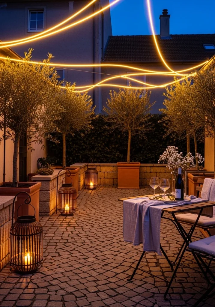 Hang string lights overhead in zigzag pattern above cobblestone patio with wrought-iron lanterns on walls for layered evening lighting.