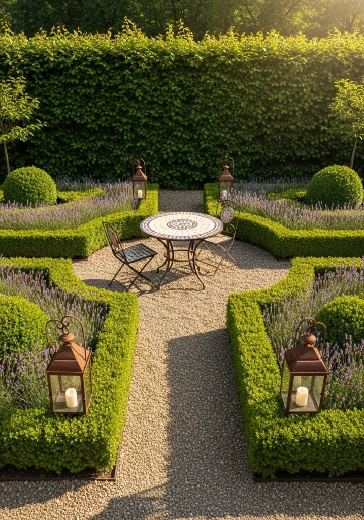 Add wrought-iron lanterns along paths and soft lavender plantings. The formal structure creates sophisticated European garden formality.