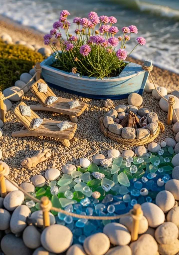 Create seaside atmosphere with pale pebbles, driftwood elements, and miniature nautical details. This theme works well for covered porches or protected outdoor areas.