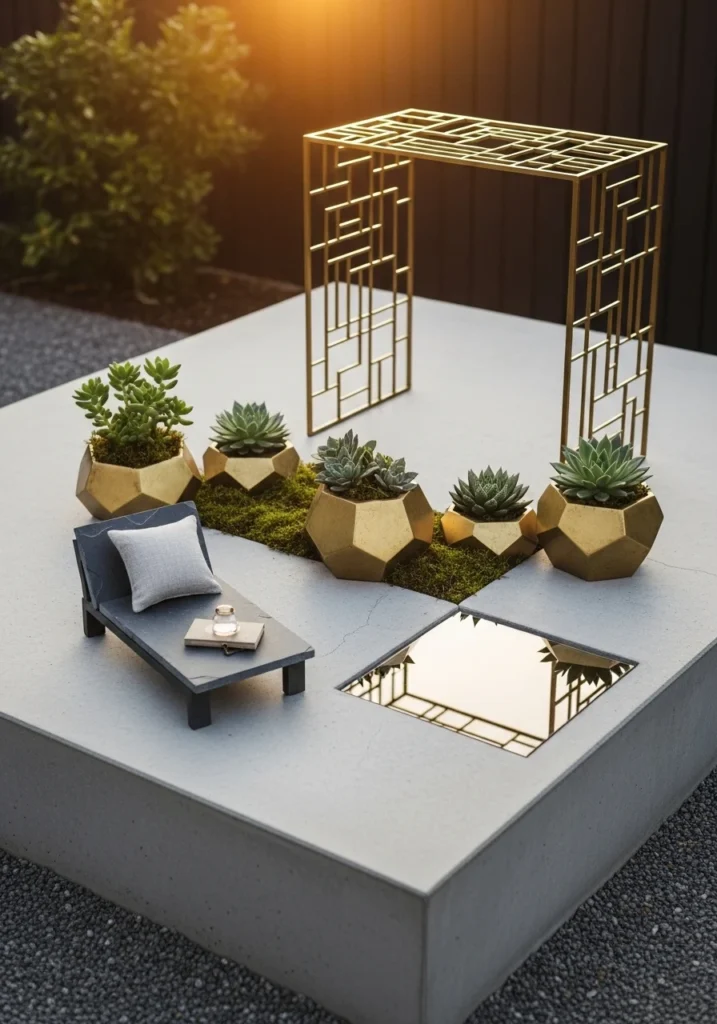 Design a contemporary fairy space on a concrete plinth with geometric brass planters and restrained succulent plantings. This modern interpretation proves fairy gardens can be sophisticated and minimal.