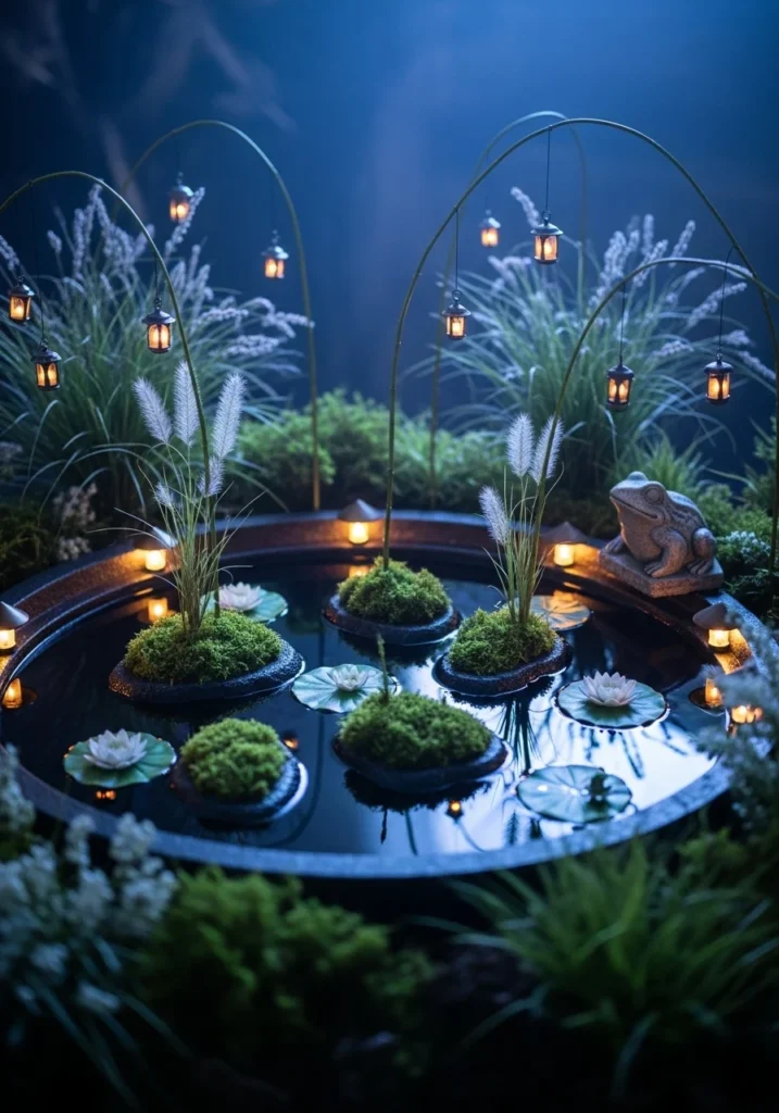 Create nocturnal drama centered on a shallow black basalt water feature with floating moss islands and illuminated details. This approach emphasizes lighting and evening enjoyment.