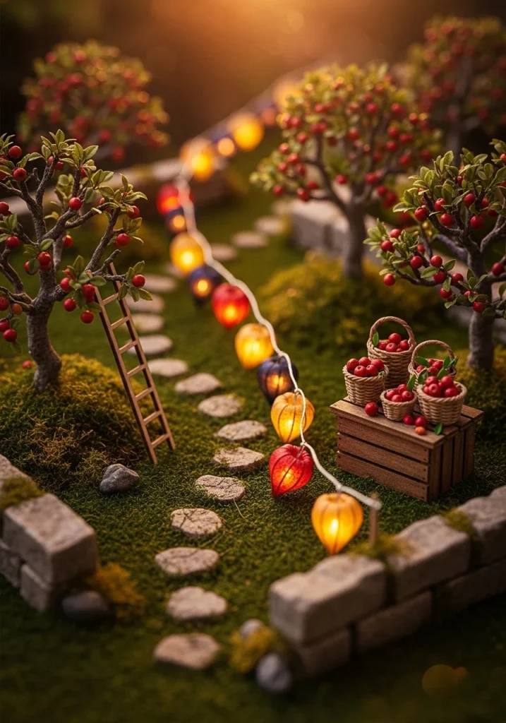 Paper lantern pathways create evening magic while tiny harvest baskets and orchard ladders tell stories of fairy industry and seasons. The living fruit trees provide genuine seasonal interest.