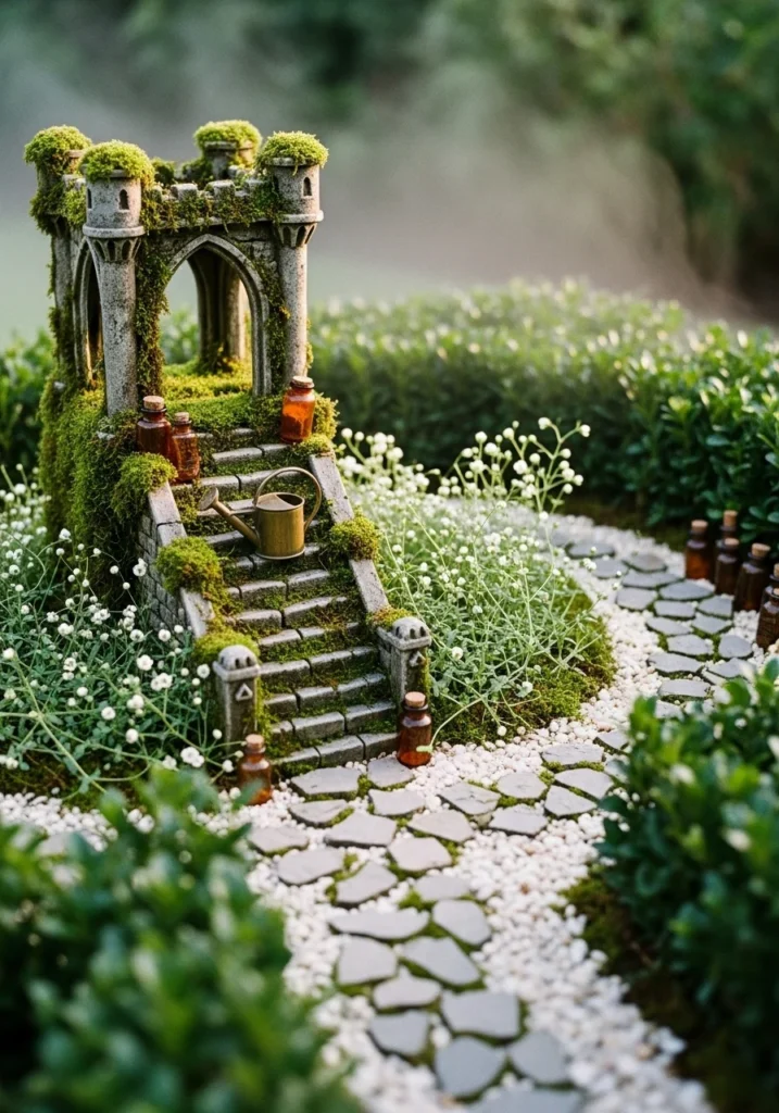 Create a romantic miniature landscape featuring weathered stone folly elements and moss-covered steps set within clipped boxwood hedging. This approach integrates fairy garden elements into formal landscape design.