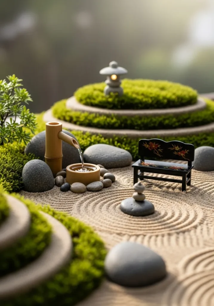 A miniature bamboo water feature adds gentle sound while moss terraces provide living green elements. The restrained palette and precise placement create calming sophistication.