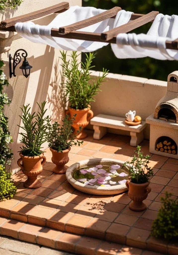 Shallow water features with floating petals add Mediterranean atmosphere while tiny wood-fired oven details create narrative interest. The bright light and high contrast make this particularly photogenic.