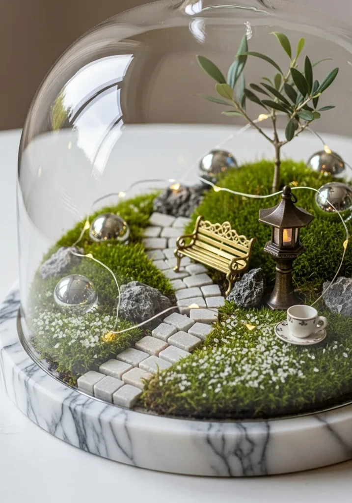 Create a sophisticated tabletop fairy garden inside a large blown-glass cloche set on bookmatched marble. Layer micro-moss lawns with tiny limestone pathways and incorporate miniature brass furniture for jewelry-like precision.