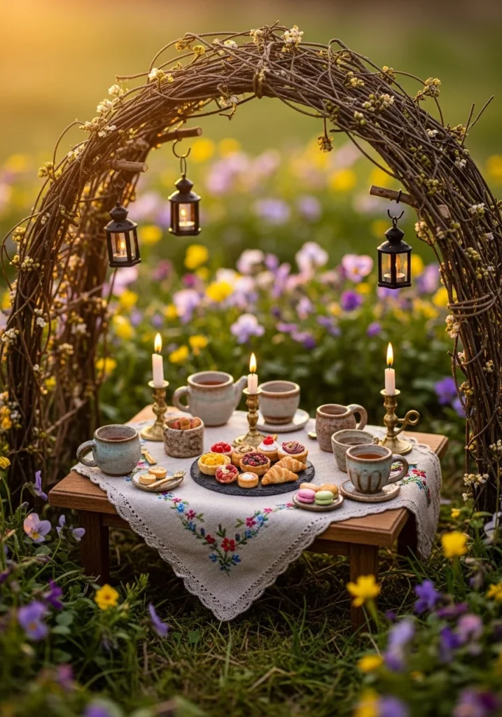 Stage a whimsical gathering scene with miniature table settings and refined details under a tiny arched arbor. This narrative approach creates engaging storytelling through careful styling.