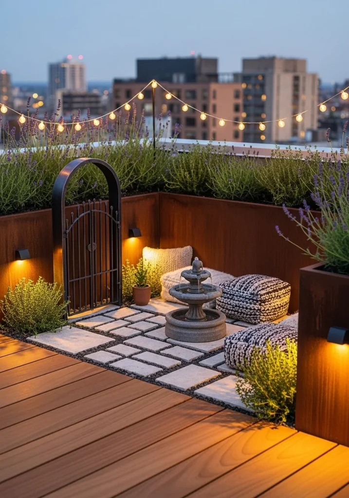 The weathering steel develops beautiful patina over time while miniature festoon lighting creates evening atmosphere. Dwarf herbs like thyme and lavender provide both fragrance and realistic landscaping at fairy scale.