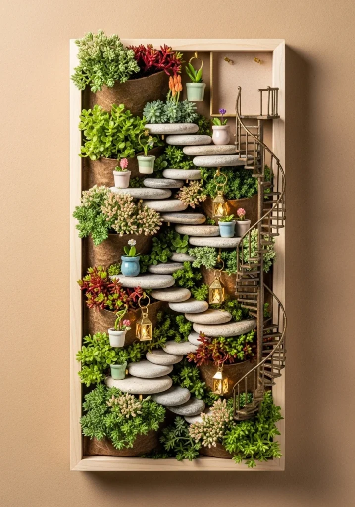 Mount a vertical fairy garden on slim timber framing with pocket planters and miniature bronze staircases connecting different levels. This space-efficient approach works well for small apartments or indoor spaces.