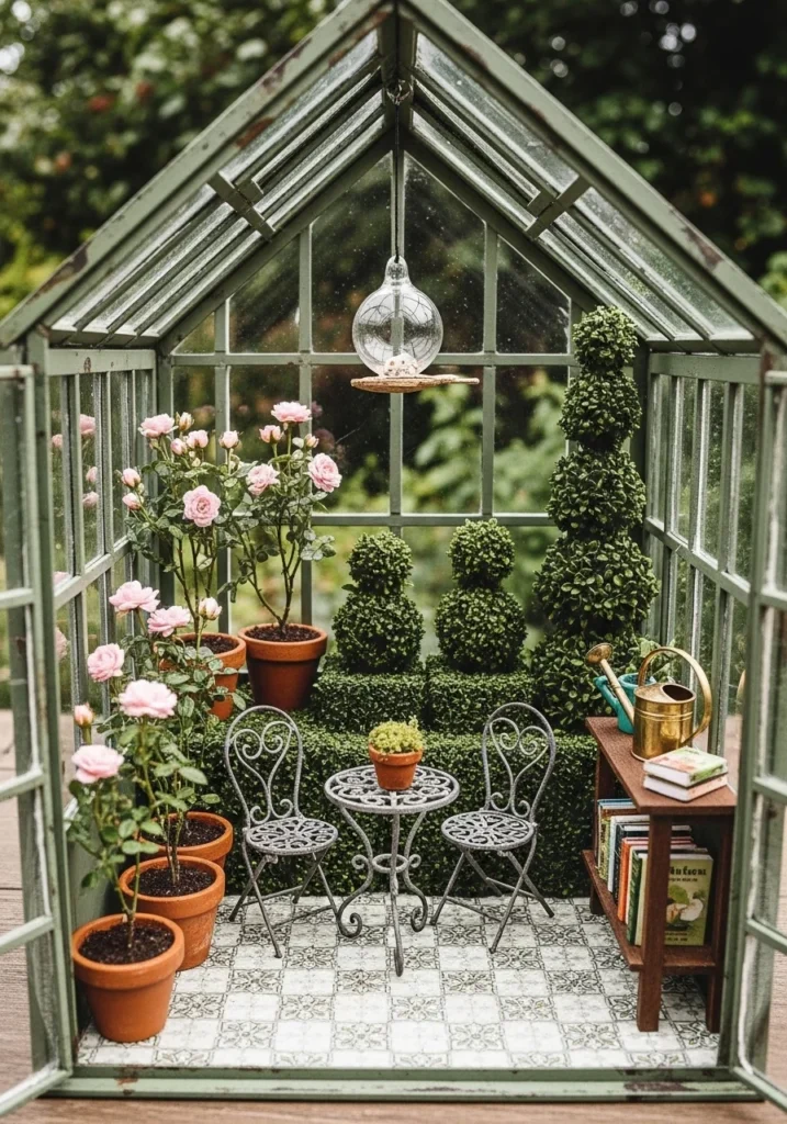 Design an intimate miniature orangery scene inside a glass structure with scaled furniture and potted miniature plants. This garden-within-a-garden concept creates sophisticated layering.