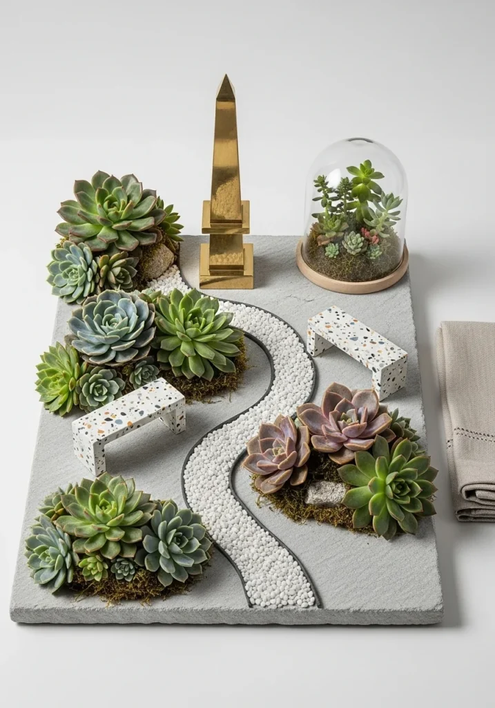 Design a contemporary vignette on a single limestone slab with sculptural succulents and miniature modern furniture. This minimal approach lets quality materials and plant forms shine.