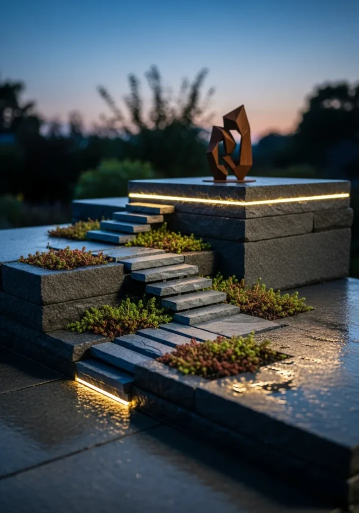 Linear LED lighting recessed into stone emphasizes architectural forms while sparse sedum plantings provide living elements without overwhelming the stone composition. This style ages beautifully as materials weather.