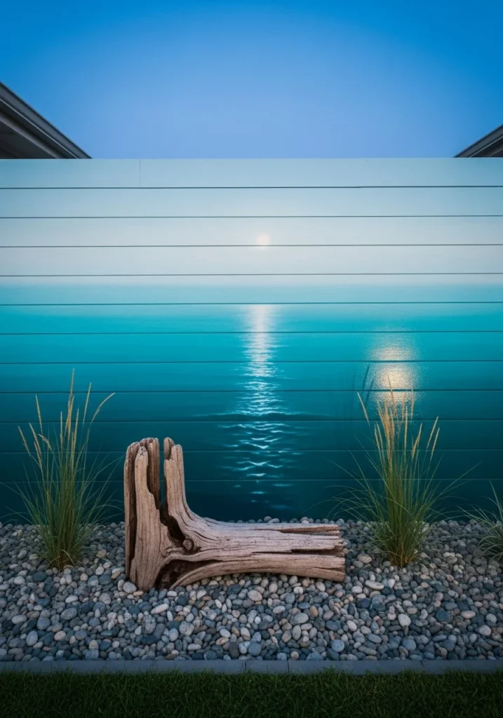 A seamless ombré from pale sky blue to deep sea teal makes small backyards feel instantly bigger. The secret is adding glossy varnish glaze on the “sea” band so it catches reflections and looks almost wet.