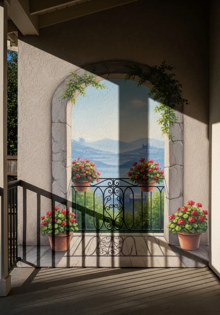 Paint a trompe-l’oeil French balcony with wrought-iron railings, potted geraniums, and a distant painted skyline. Add aged stucco texture to really sell the illusion.