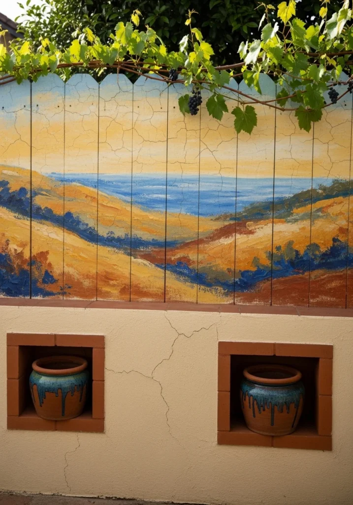 Inset terracotta planter boxes right into the fence design and add climbing grapevines that blur the line between mural and reality. Mediterranean light makes this look absolutely stunning, but it works anywhere with decent sun exposure.