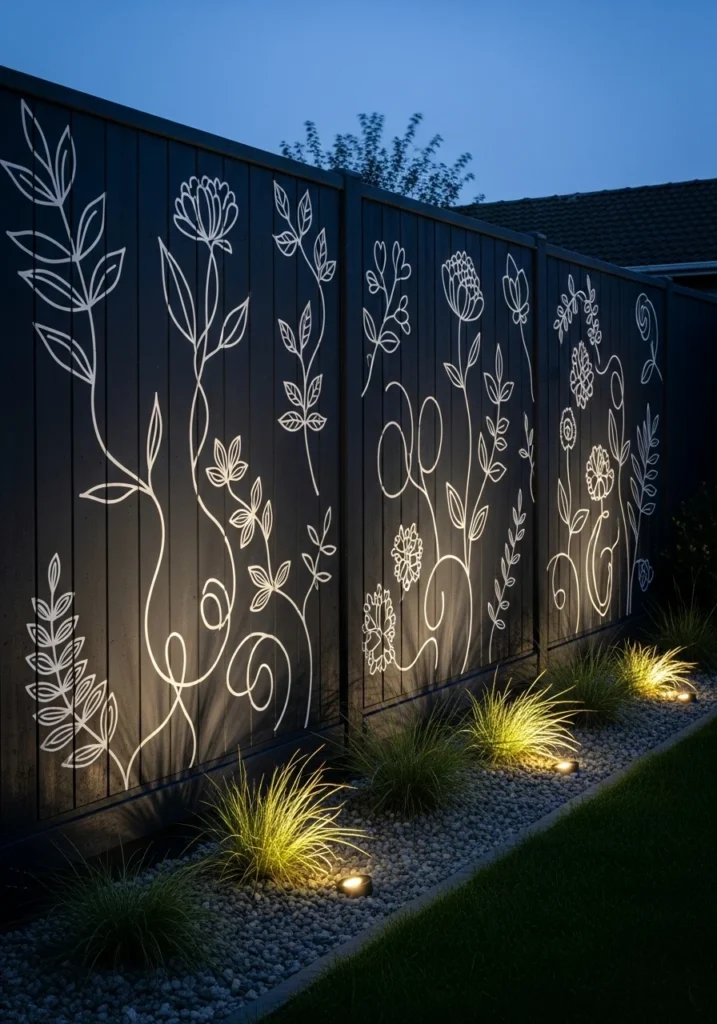 Continuous single-line botanical drawings in matte white on deep charcoal-stained fence create striking contrast. Integrate low uplights at the fence base for dramatic silhouette effects at twilight.