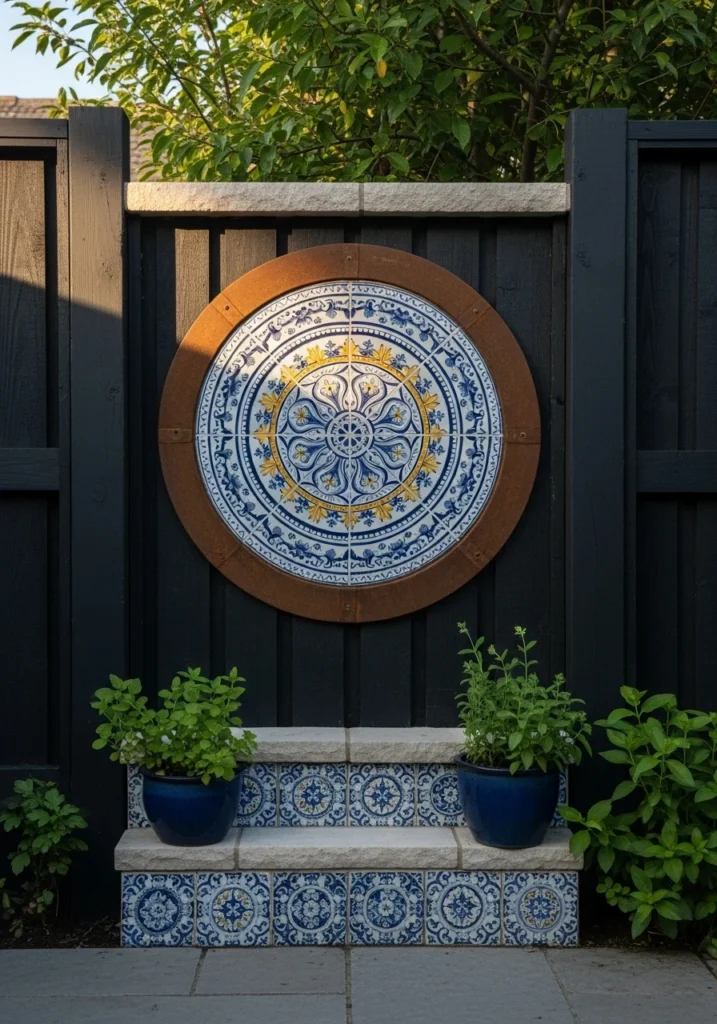 Paint an inset circular azulejo-style ceramic pattern set into dark-stained cedar, framed with a painted corten-steel ring. You get the handcrafted European charm of actual tile work without the expense or installation headache.