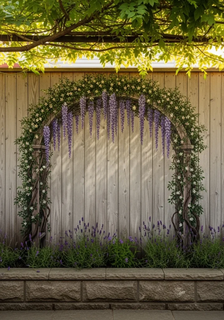 Paint cascading wisteria or climbing jasmine creating the illusion of a faux-arched pergola right on your fence. The trick is getting the shadows and depth right so it actually looks three-dimensional.