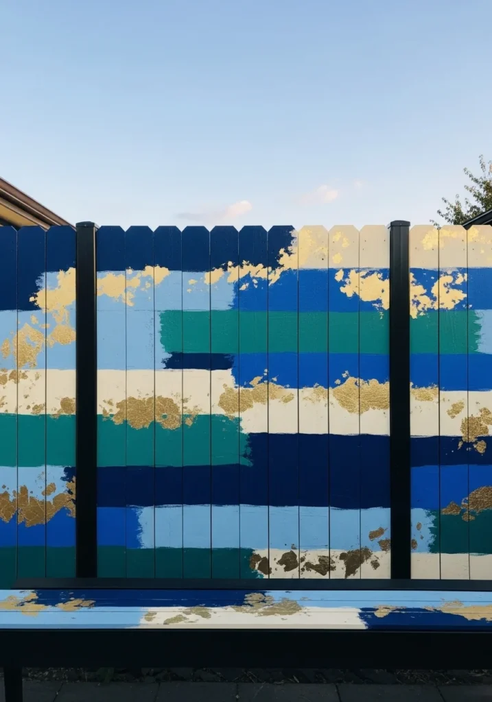Broad painterly brushstrokes in cobalt, teal, cream, and gold leaf accents across segmented wooden panels with black steel posts between. This is for people who want their fence to feel like a gallery installation.