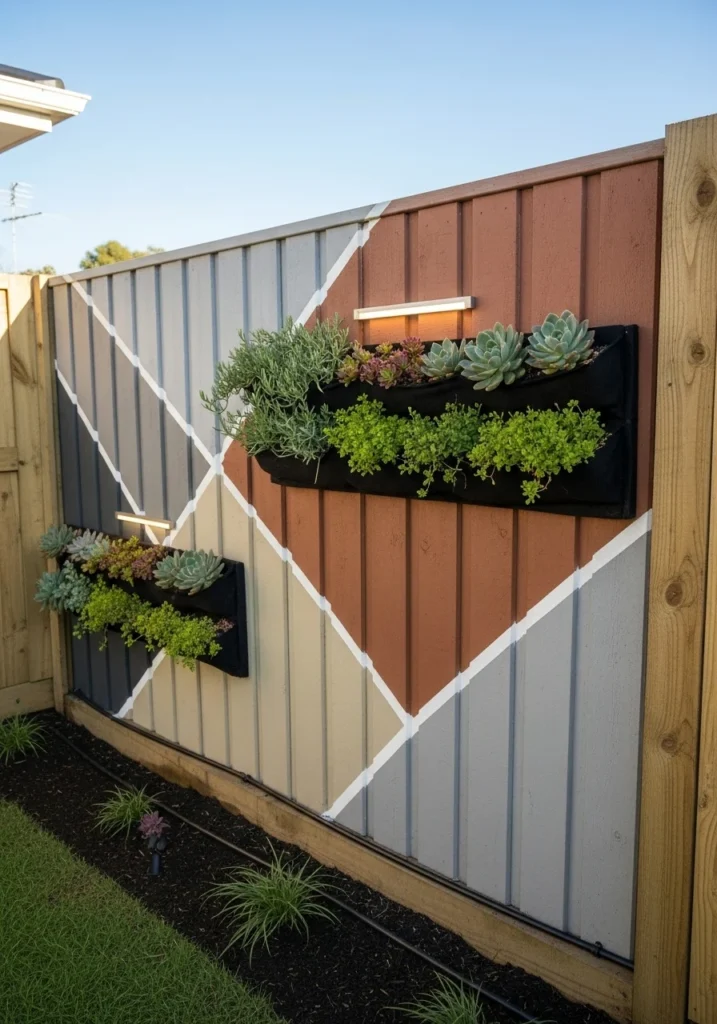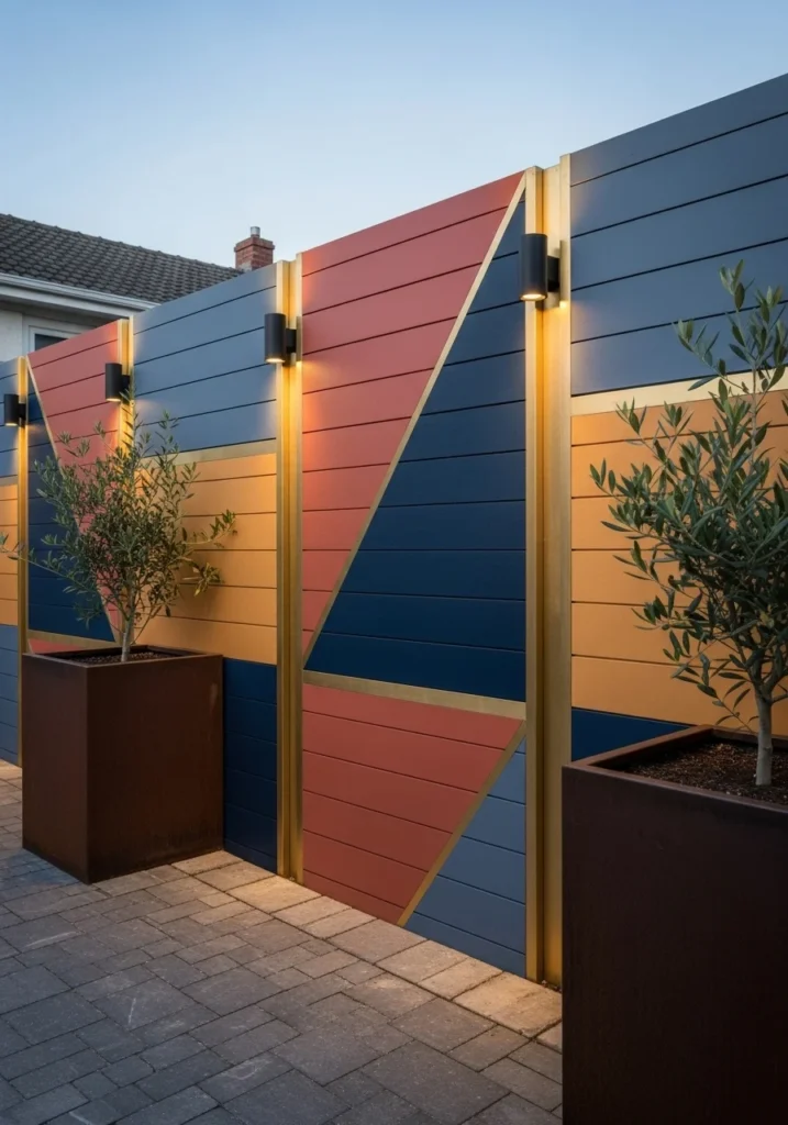 Modular geometric panels in terracotta, deep indigo, and muted ochre separated by slim brass or copper reveal strips create a seriously upscale look. Paint these on horizontal slat fencing for the cleanest effect.
