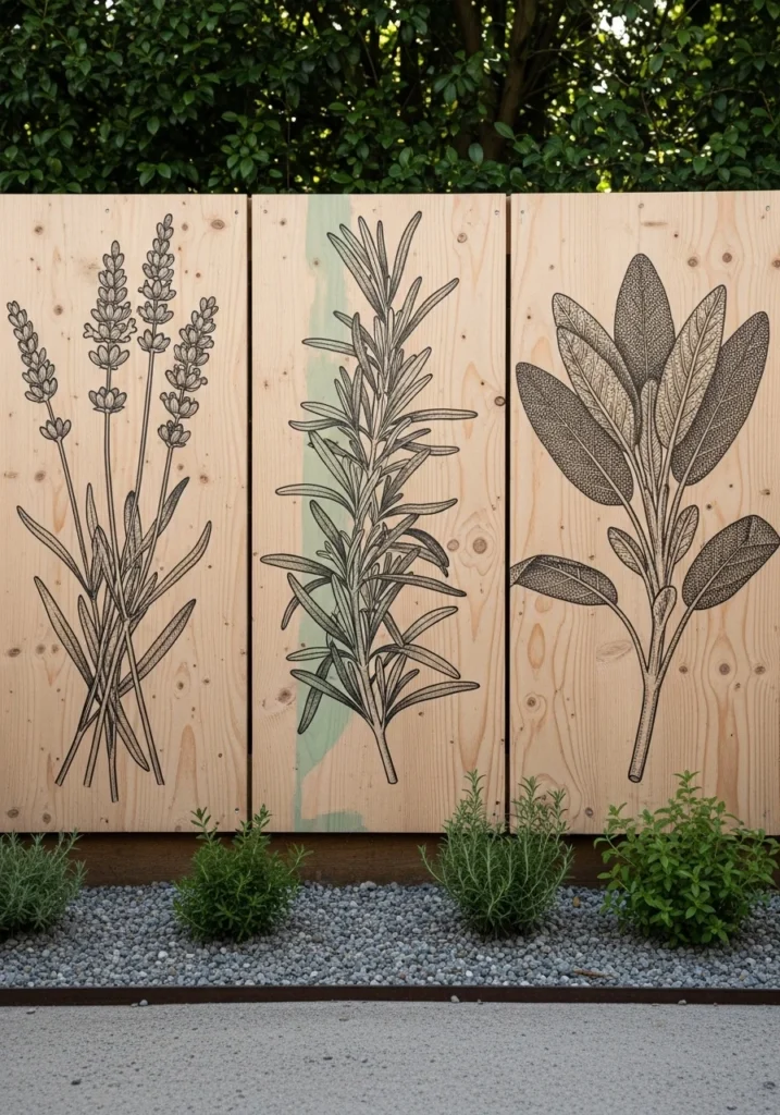 Oversized pressed-herb illustrations—lavender, rosemary, sage—rendered in sepia and soft sage ink on raw cedar panels. Add subtle varnish for protection while maintaining that natural history museum vibe.