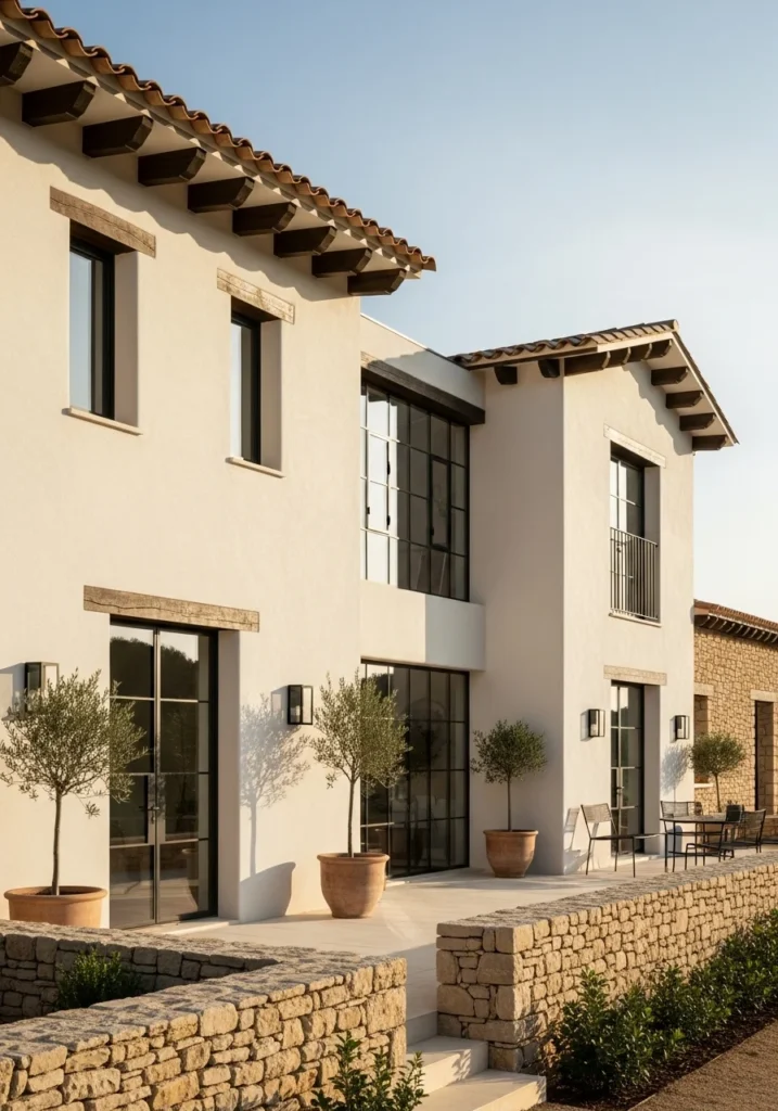 Black steel casement windows provide modern contrast while dwarf olive trees in terracotta pots bring Mediterranean authenticity. Low stone walls define boundaries without blocking sightlines, maintaining an open, welcoming feel.