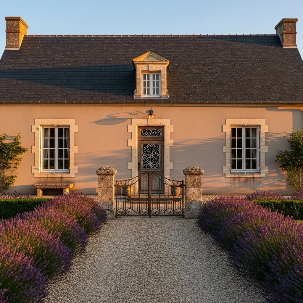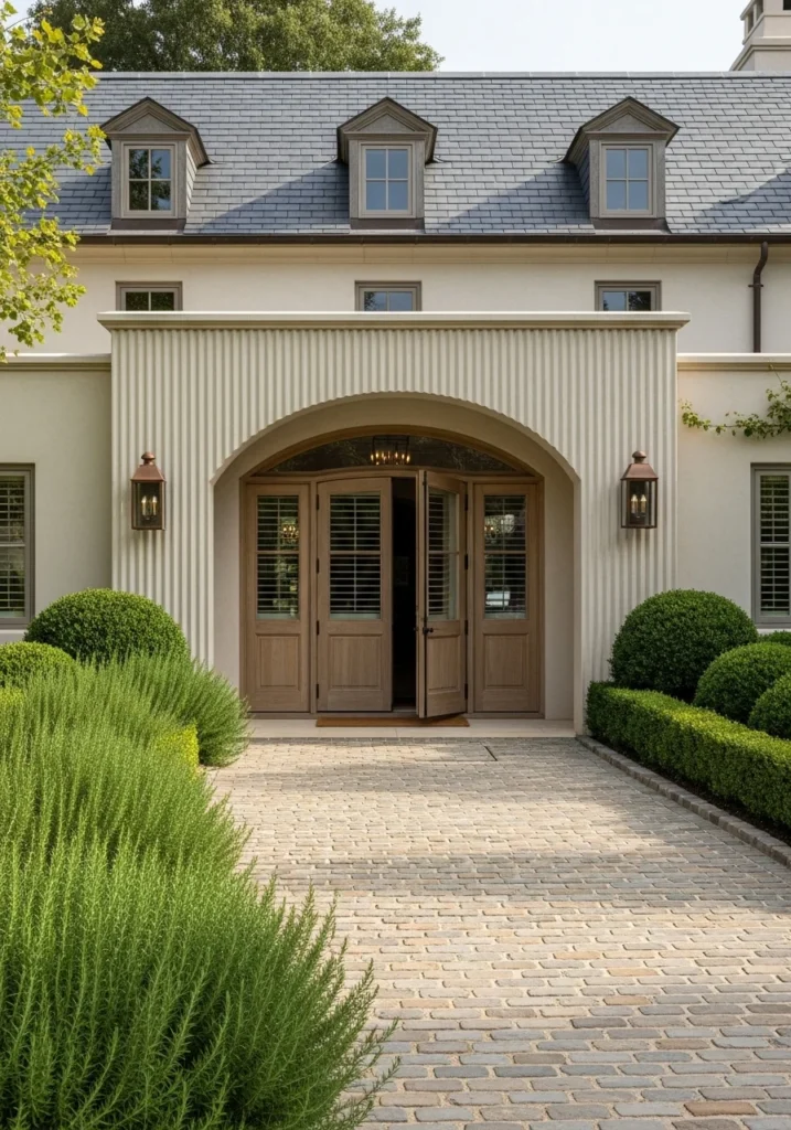 Center an arched oak door with wrought-iron hardware and flank it with casement windows featuring lavender boxes. Gravel drives and clipped boxwood borders complete the classic Provençal approach. The slate roof with modest dormers adds vertical interest without overwhelming the proportions.