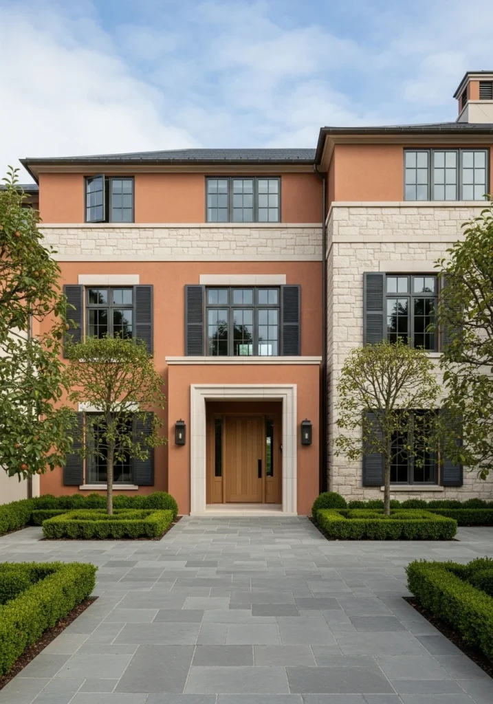 Add architectural definition with limestone belt courses against warm plaster walls. This subtle detailing creates horizontal emphasis while matte black shutters provide strong contrast and contemporary edge.