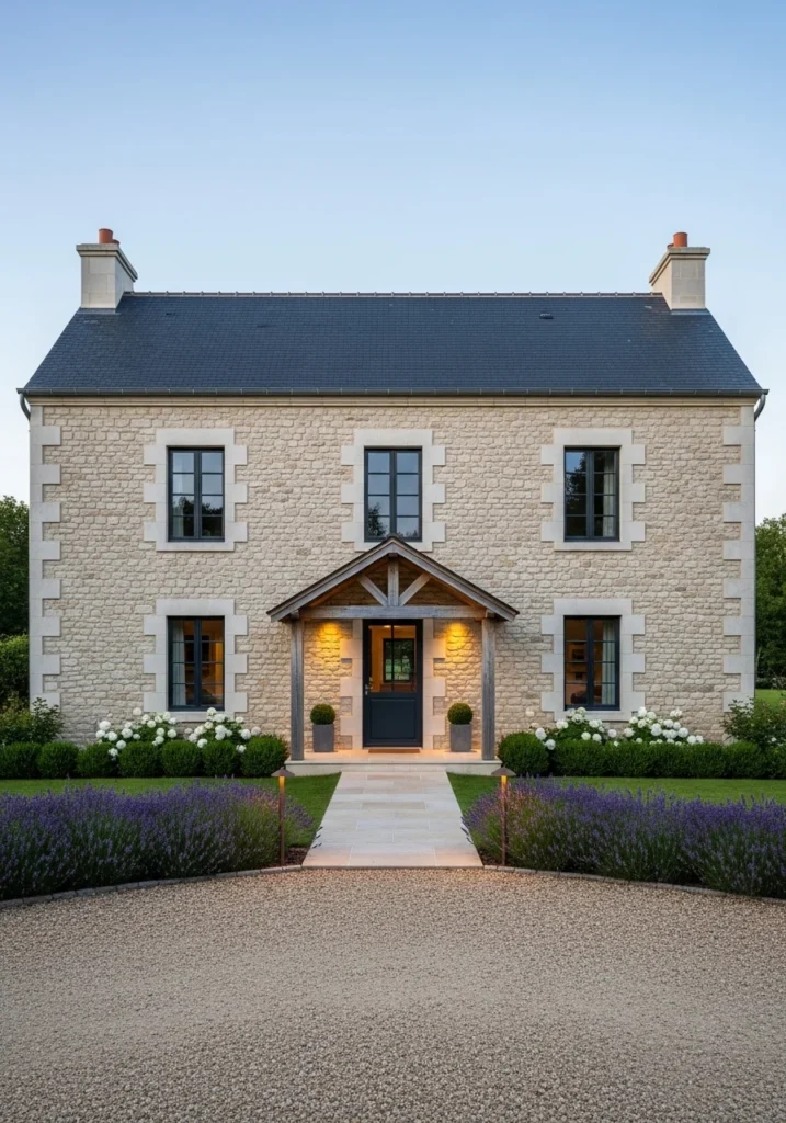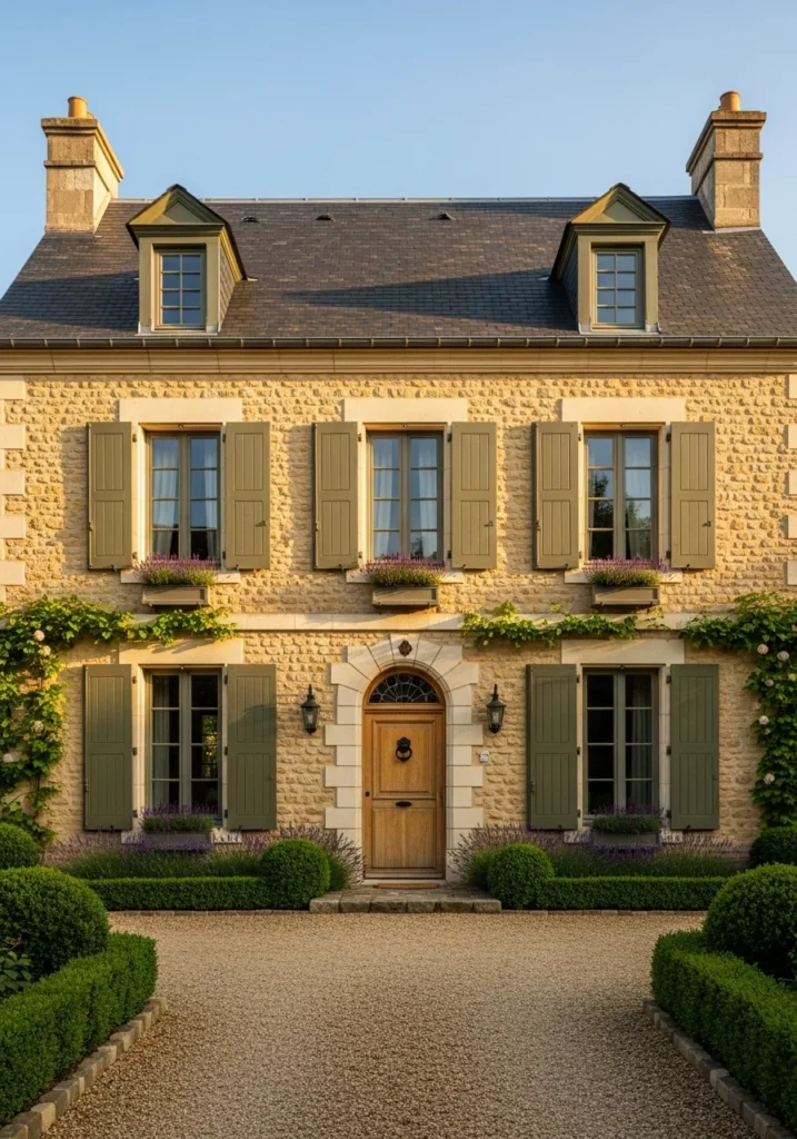 Build your facade around warm limestone in honey tones, paired with aged oak shutters in deep olive green. The combination creates instant French countryside authenticity while the natural stone ensures beautiful aging over decades.