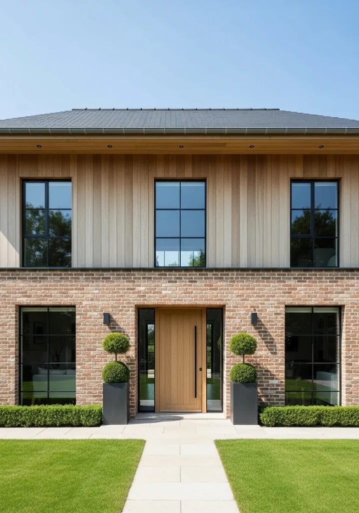 Combine soft brick on the lower level with vertical timber cladding above for contemporary French country fusion. This mixed-material approach adds visual interest while maintaining warmth and texture.