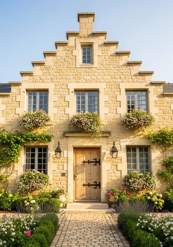 Design around a distinctive stepped gable silhouette that creates memorable roofline interest. Abundant windowboxes with seasonal blooms add living color while the pale limestone provides neutral backdrop.