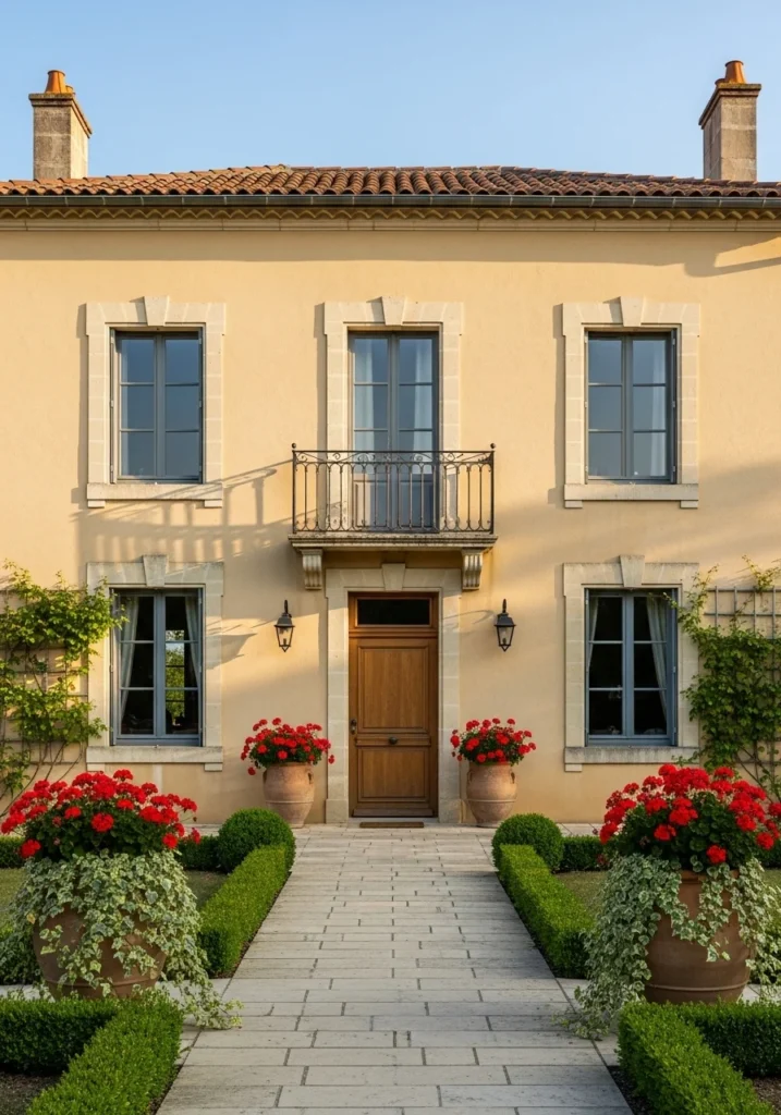 Build around warm ochre render with small wrought-iron Juliet balcony above the central entrance. Balanced pairs of casement windows create formal symmetry while maintaining livable scale.